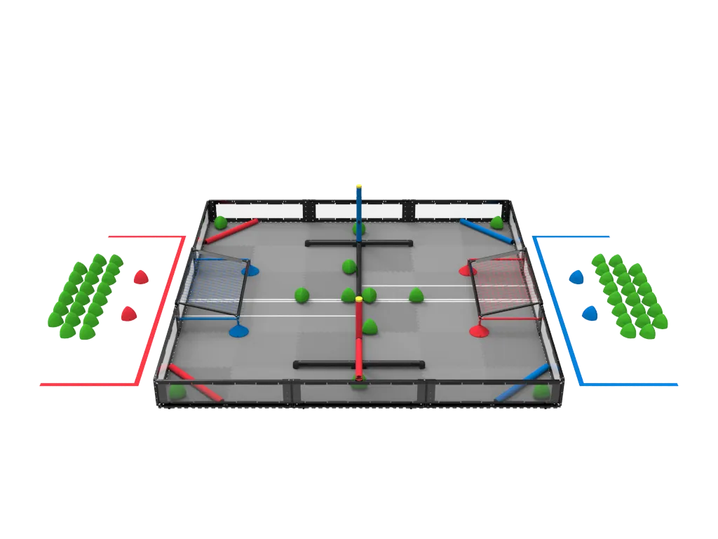 Over Under is a soccer-like game, played by two competing alliances (an alliance consists of two teams, each of which builds and competes with one robot) There is a central barrier dividing the field (whose ground is made of foam tiles) into two halves; each half contains a goal to score oddly-shaped triballs in. Each game starts with a few trials on the field and team members can introduce triballs onto a robot under certain conditions (this is called match loading). There are two alliance-specific climbing locations where robots can elevate themselves on poles in the last few seconds of the match to earn a climbing bonus. A match consists of a 15-second autonomous period where robots move on their own and a 1 minute, 45 second driver controlled period.