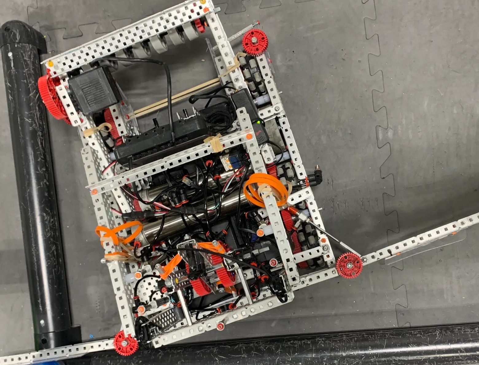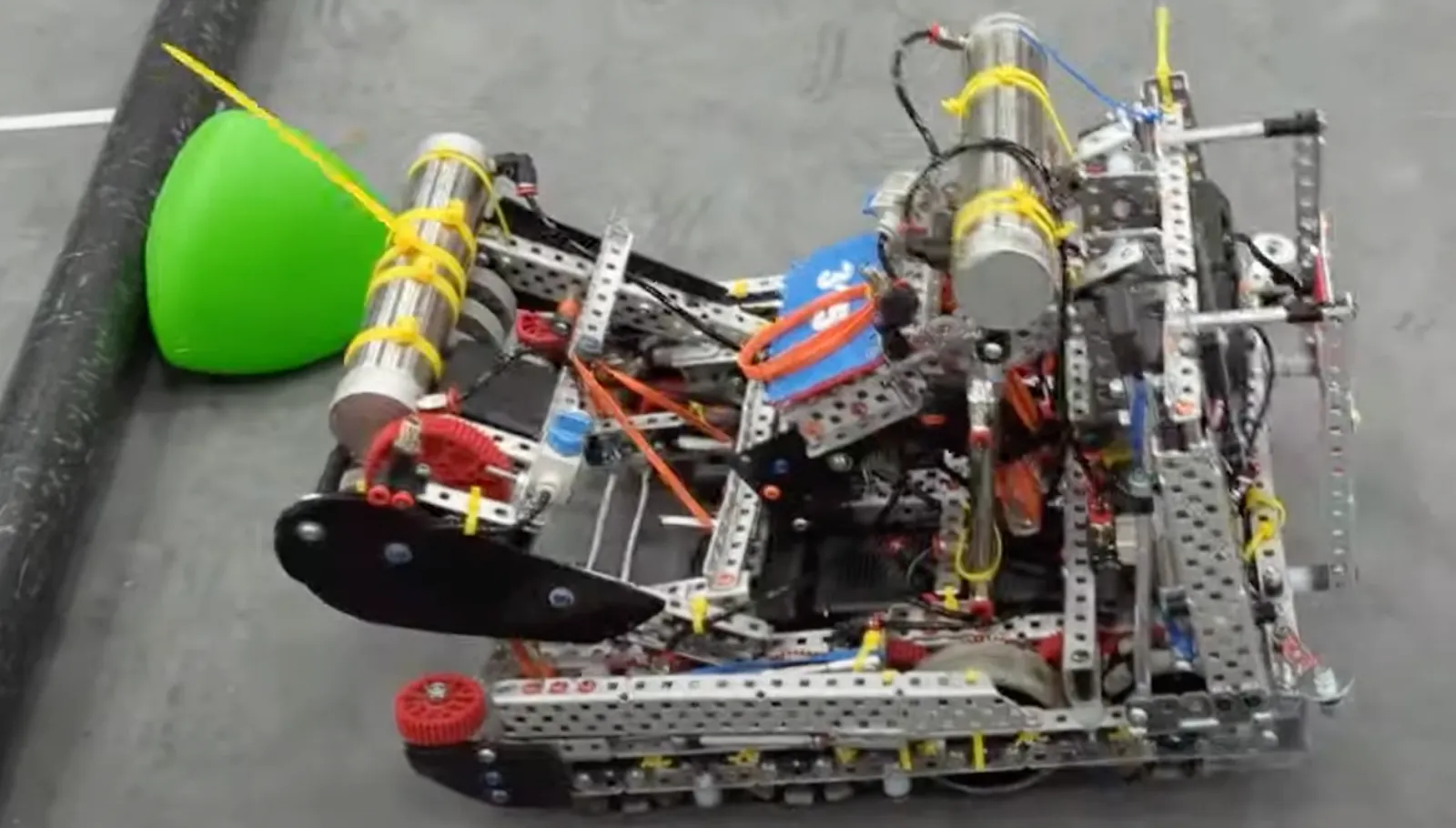 Eventually, though, the game became more defensive. Some smart cookie somewhere realized that with specially shaped wings, robots could easily push over and score triballs catapulted by the opponent alliance. This strategy initiated the rise of robots which, like leeches, stole opponents’ triballs instead of introducing their own. In order to avoid such effective strategies, triball control became the name of the game. This evolved into two main meta strategies. The first is one-by-ones, in which a single triball is placed into a robot’s intake; then, the robot drives over or around the barrier to score it. One-by-ones are almost completely resistant to defense (only inferior to specialized robots which are designed to steal triballs from intakes), but fairly slow in scoring. The second strategy is bowling, in which numerous triballs are placed in front of a robot, which then drives around the barrier to push all of them into the goal. Bowling can easily score one hundred points in a minute, but is more prone to getting disrupted by defense. Most teams, including us, used a combination of the two, in which the strategist makes a choice about which strategy to use based on the state of the match. In order to facilitate this change in game strategy, we built our second robot, Marvin. Marvin maintained the same drivetrain, but added two motors to improve torque (the number of motors doesn’t impact speed). Marvin also had a dramatically improved flex-wheel intake, which eventually became the intake of choice among teams. We also made the catapult faster (however, from that point on, we made the decision to only use the catapult in skills runs, where there was no opponent). Finally, because we moved motors from the climber to the drivetrain, we redesigned our climbing mechanism to be a fast and effective pneumatic hang. We maintained the same wings, as they were super effective in pushing around triballs, but added a second air tank to accommodate the climb. It was with Marvin that we won a tournament for the first (and, unfortunately, last) time.